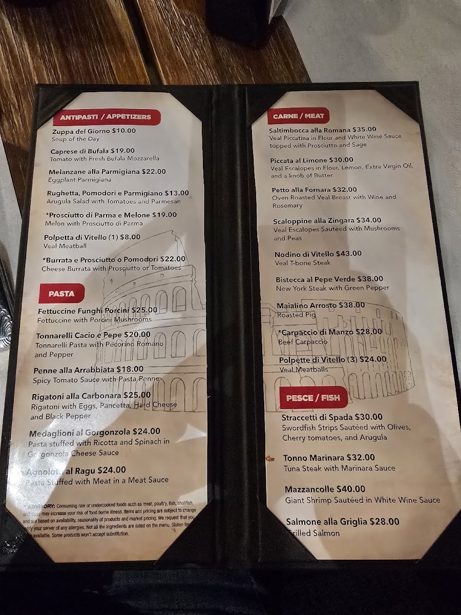 Start your culinary journey with exquisite Antipasti such as Insalata Caprese Di Bufala and Melanzane Alla Parmigiana. The Prosciutto di Parma e Melone pairs perfectly for a refreshing appetizer. Dive into the Pesce selection, featuring Straccetti di Spada and succulent Mazzancolle that shimmer with a hint of white wine.